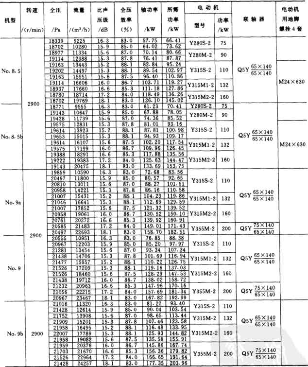 1.風(fēng)機(jī)制成單吸人,機(jī)號(hào)有No.8a、8、8b、8.5a、8.5、8.5b、9a、9、9b,共九種。